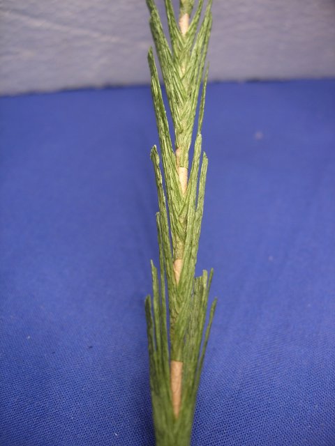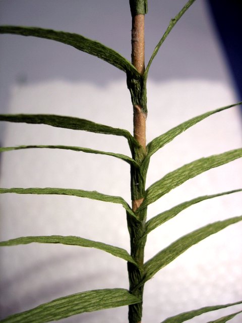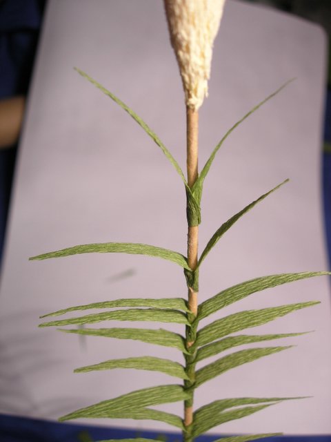 Paso 7º : Pegar una a una las hojas en el alambre como se ve en la (foto nº 10) . En este paso hay que poner un poco de cuidado, porque las hojas de las cañas crecen perpendiculares en cada uno de los lados como las plumas de los pájaros (no crecen en todo alrededor de la caña) , (foto nº 11) . Procurad no forrar toda la caña de hojas, hay que dejar espacios sin hojas , (foto nº 12) .