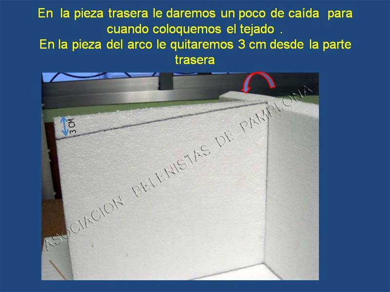 En la pieza trasera le daremos un corte en inglete para cuando coloquemos el techo tenga inclinacion .A la pieza del arco le cortaremos 3 cm para colocar el techo con la inclinacion necesaria .