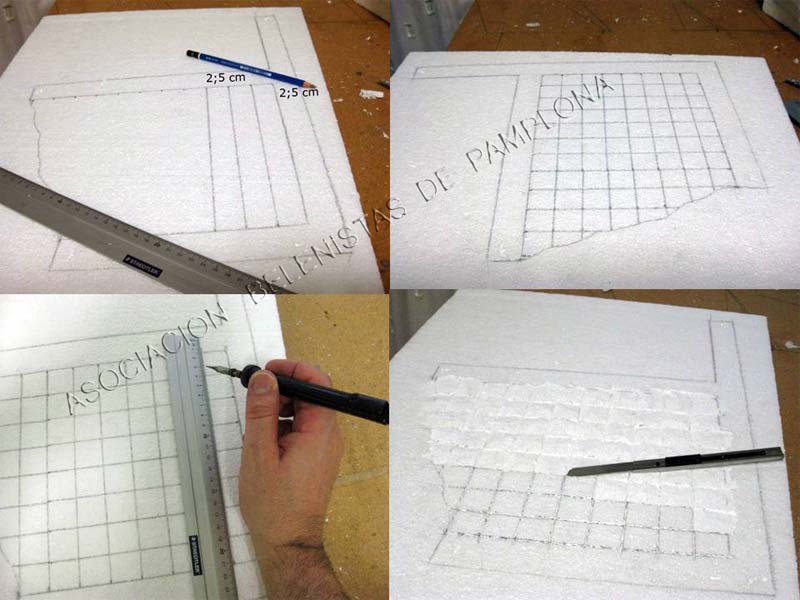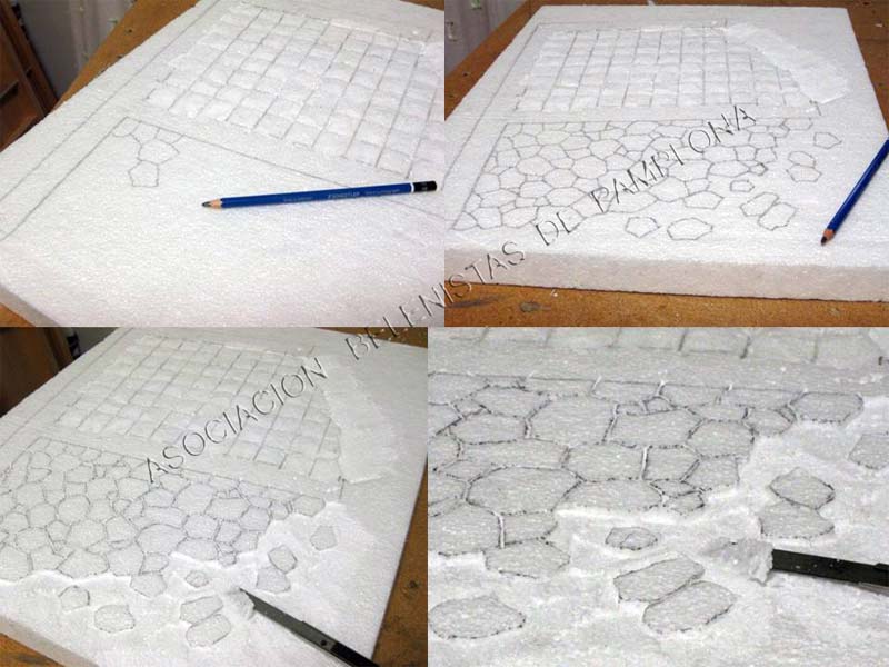 Bueno en el post anterior ,en una de las fotos se puede apreciar ,que una vez dibujado tanto el suelo de baldosa como las lajas de fuera ,con el soldador y ayudado con una regla metálica paso la punta caliente por todas las lineas dibujadas .Después con el cúter empezamos a dar forma a las baldosas y lajas ,a estas lo que se aprecia en la foto les quito parte del suelo delantero para que queden un poco mas altas ..ver foto .
