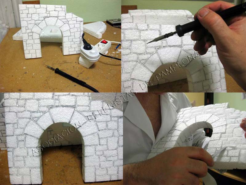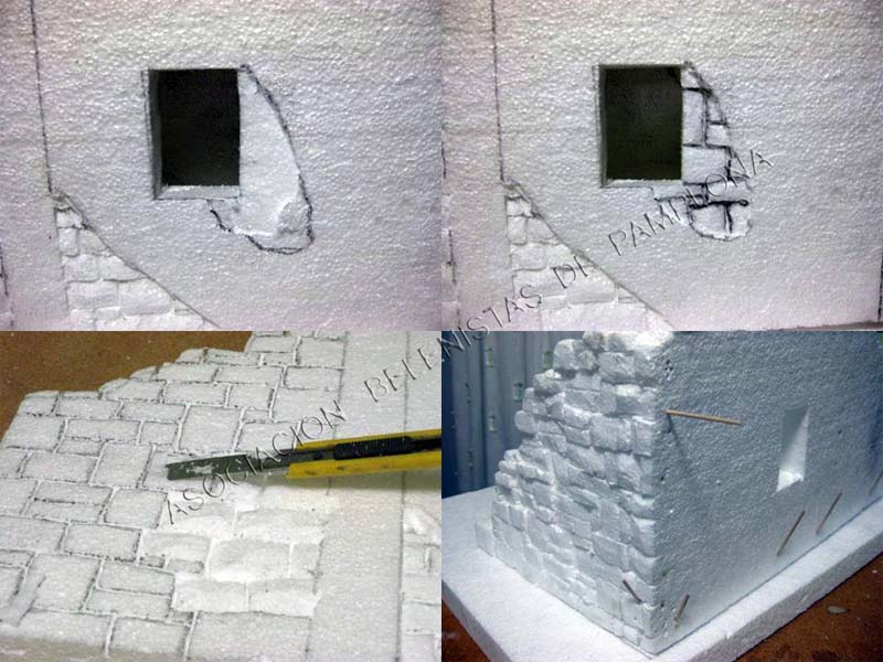 Una vez pasado el soldador iniciamos la talla de las piedras ,dando diferentes volúmenes y comiendo de forma irregular ,una vez echo este primer paso ,yo suelo pasar otra vez el soldador por las juntas y asi consigo dar mas volumen a la pared .