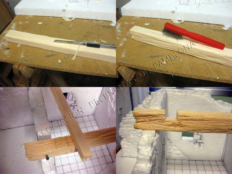 También como les daremos la textura simulando las vetas y madera envejecida ,utilizaremos el cúter y daremos unos cortes ,no muy profundos a la diferentes piezas ,luego con un cepillo de alambre daremos una pasadas ,ojo ,siempre en la misma dirección ,pues el porex tiene beta .
