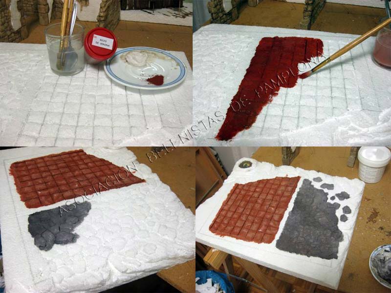 Una vez seco la primera mano ,con poca pasta ó nada iremos dando ligeras vetas a las piedras ,emplearemos tonos ocres ,dar un poco y con el dedo esparcir por la piedra ,proceso que hay que hacer piedra a piedra .