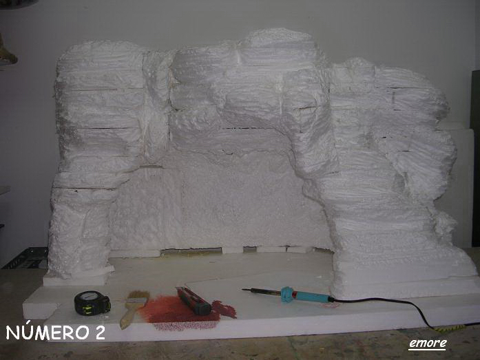 Las placas de porexpán las pego poniéndole una finísima capa de cola blanca rápida y cuando han trascurrido unas 48 horas de haberlas pegado, le voy dando forma con el cútter.