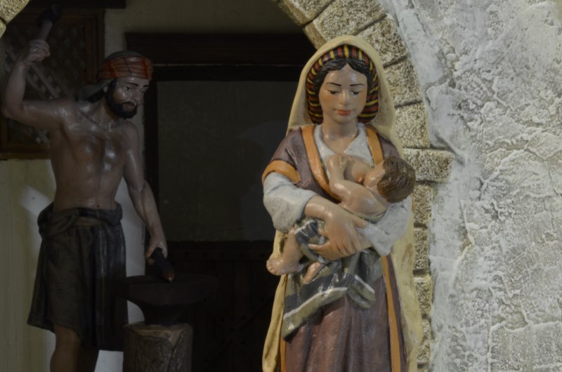 En la Segunda imagen, PC_05,he tratado de conseguir una profundidad de campo ampliada porque mi intención era contrastar la ternura de la madre amamantando a su hijo frente con la rudeza del trabajo que está realizando el herrero. Ambas figuras están enfocadas, hasta se aprecian los detalles de la celosía situada detrás del herrero. Las figuras están situadas a la misma distancia que la foto anterior, ya que he utilizado un trípode para que la distancia no varíe