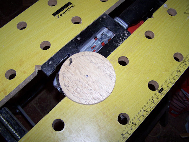 Hola,os pongo como hice los aros de madera para las ruedas de mi carro.En un banco ponemos la caladora al reves,con la sierra hacia arriba y medimos el radio de la rueda,a continuacion clavamos el trozo de madera con una punta donde nos de el radio que queremos y solo se trata de ir dando la vuelta a la madera y ya esta.Decir que en estas fotos ya habia sacado la circunferencia exterior del mismo modo,lo que no hice foto