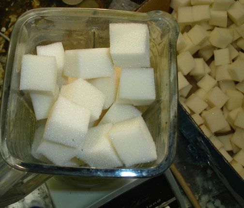 Hello Mario, I tell you that we dye the sponge first and after drought we cut her in small chunks and spend(pass) it for the licuadora.