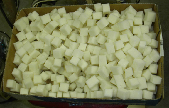 El primer paso que hice fue cortar la almohadilla de espuma (16 "x 16" x 1 ") en pequeñas, aproximadamente, un" tamaño de los cubos. Este tamaño no es tan crítica como esta sólo permite que las piezas para encajar en la licuadora más fácil. Tuve la oportunidad de cortar dos almohadillas en cubos mientras ve la televisión. La imagen muestra dos pastillas por valor de cubos en una tapa de caja de papel fotocopiadora.