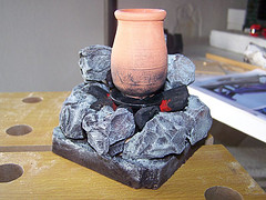Con el porex cortas unos trozos y los mordisqueas con lo que tengas a mano yo utilice unos alicates de pico gorrion, asta darle forma de una piedra. primero se hace una base de ocumen o perex de alta densidad, lo primero la bombilla, a continuacion las piedras que hemos hecho y las pegamos colo camos las estrevedescon todo pegado pasamos el macarron que servira para el aire, esto previo a estar unido por medio de un agugero a una olla y bien pagada para que no salga el agua, pegamos la olla a las estrevedesy pintamos, en esto ya no soy un manitas lo que se lo e aprendido del foro de una forera creo que se llama Lola las tecnicas de pintura.