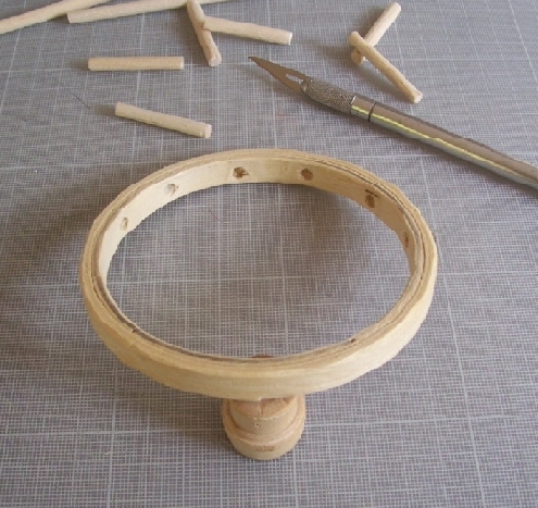 3. Con cuidado, perforamos los huecos para los agujeros en el aro de la rueda; donde corresponda. No traspasando la madera sino llegando a la mitad de su grosor.