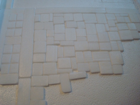 Para hacer las losetas, corta un trozo de porex de la medida del suelo y "rómpelo" a trocitos para ir pegándolo después. O lo tallas con soldador. Dibujas primero la forma de las losetas y luego con el soldador lo remarcas (aunque es conveniente después recortar con cúter lo quemado del soldador y puede complicarse, por eso te recomiendo romperlo y pegar las piezas una a una. Más laborioso, pero menos pesado).