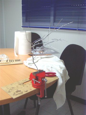 Cortas 4 trozos de unos 50 cmts y, si lo tienes, ayudada por un tornillo de banco, con los alicates enredas los trozos entre sí haciendo un "churro" procura no enredarlos demasiado para evitar que el alambre se rompa y para que se vea bien el esqueleto y los giros de los alambres (FOTO 1)A la altura que estimes oportuna, vas añadiendo trozos de alambre para hacer las ramas. Puedes cortar por ejemplo dos trozos (uno más largo que el otro) y los añades a la altura del tronco que te parezca, atravesándolo y dejando aparecer como un centímetro por detrás, para sujetarlo mejor al troco aprovechando el "dibujo" que se va haciendo a medida que enrollas los 4 hilos del tronco.