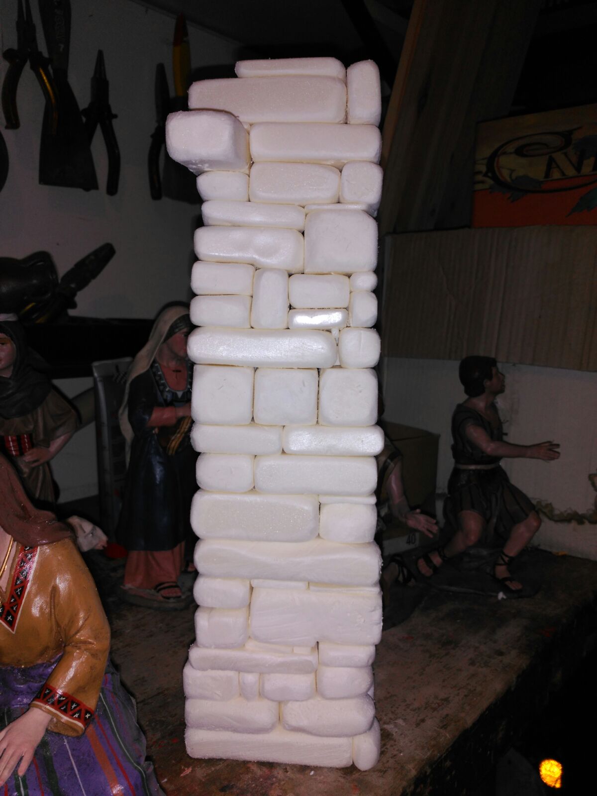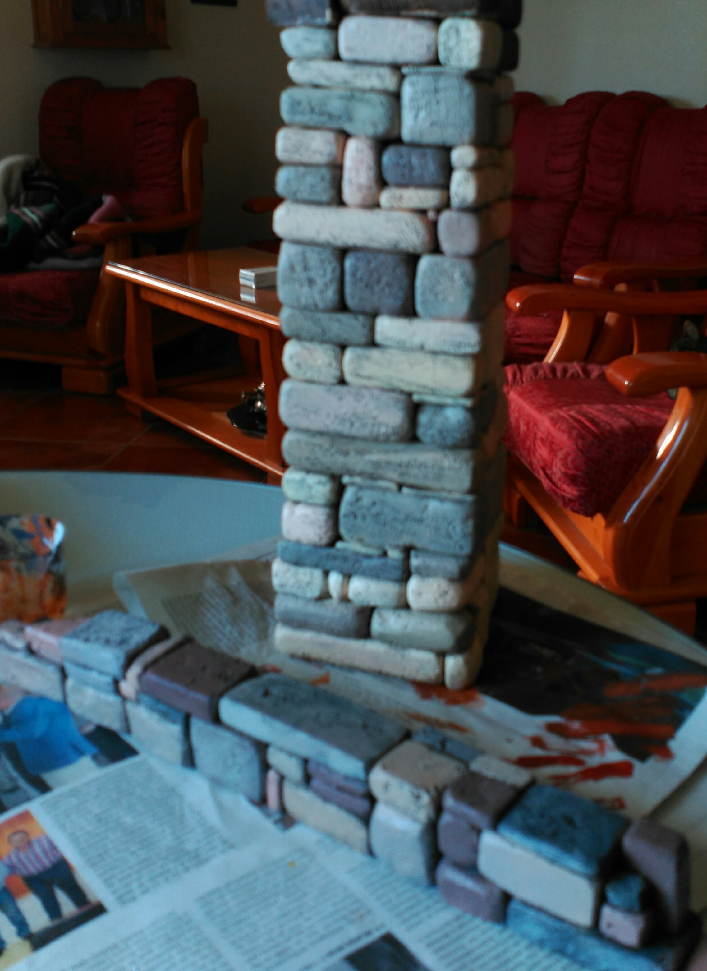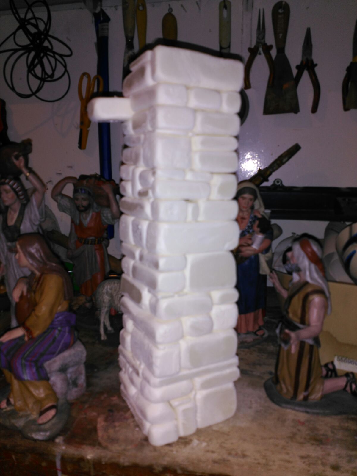 La textura: perfecta. Ahora pinta TODO, de color ocre oscuro (para más exactitud, color mierda gato, con perdón), una vez seca la pintura das con un ocre claro a pincel seco, para que vaya dejando ver el fondo que pusistes de base, que sería la suciedad que va dejando el tiempo, después das otras manos de ocre, que puedes mezclarlas muy ligeramente con tonos terrosos (ahí debes jugar un poco con tu gusto, y todo a pincel seco), para finalizar un poquito de blanco para dar algunos puntos de luz y verde oliva principalmente por las piedras inferiores, que sería la verdina y la mugre que hay en las zonas más cercanas al suelo.