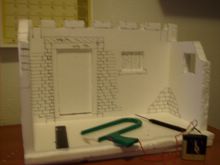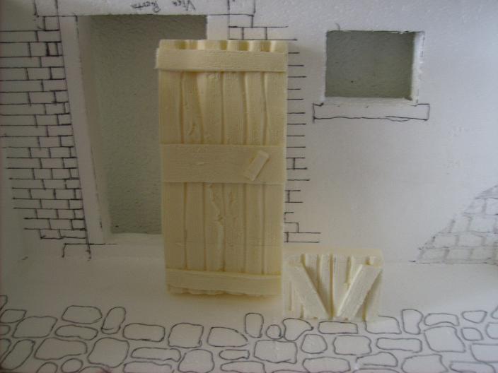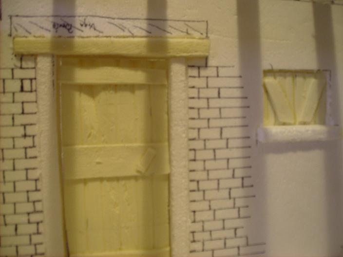 Corta unas tiras del amarillo y pegalas en el marco de la puerta para dar volumen y en la ventana tambien , se ve vastante bien la puerta ,en el suelo fabrica las piedras con amarillo y luego las pegas ,no lo hagas con el soldador.