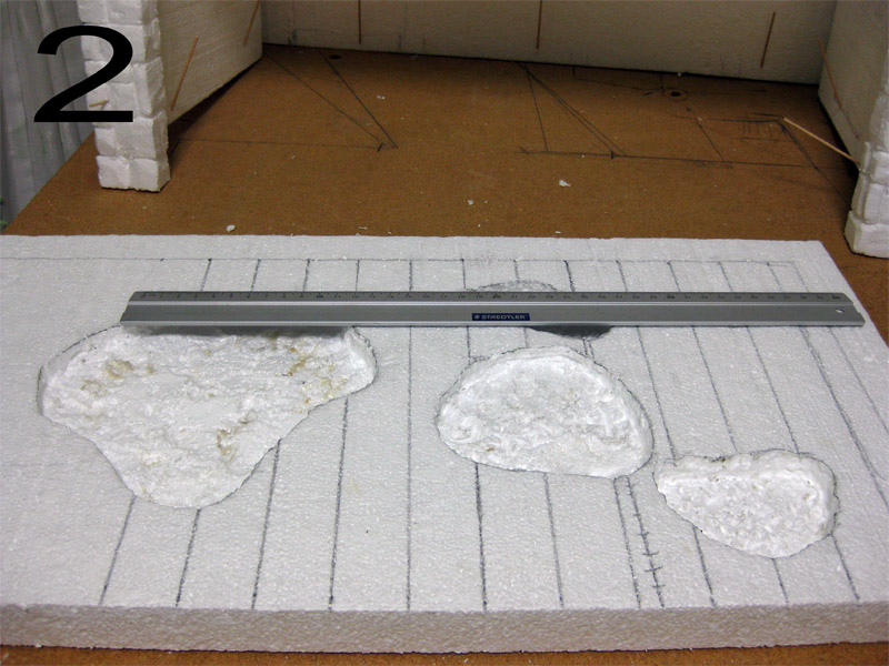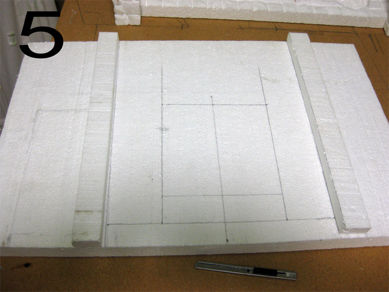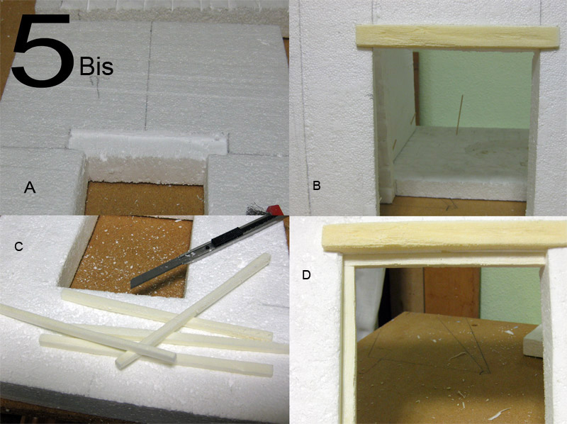 FOTO 5 BIS : Una vez dibujado la puerta y vaciado el hueco ,dibujamos la viga y rebajamos el porex según nos guste el grosor de la viga y con porex extruido hacemos la viga y la trabajamos con el cuter y el cepillo de alambre para dar textura y la pegamos .En la misma foto os muestro como fabrico una puerta ,corto unas tiras de porex extruido que me hará de marco y a su vez disimulara las posibles grietas que nos queden al hacer la puerta con el porex extruido