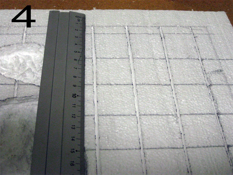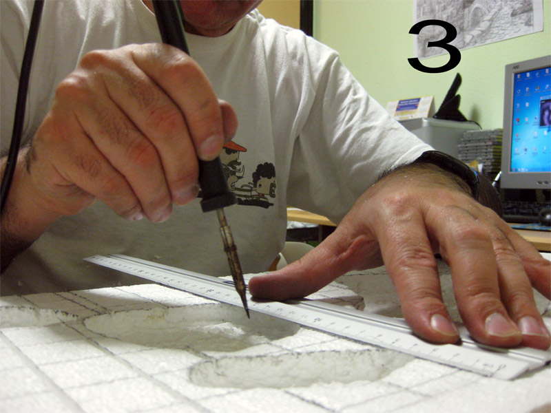 FOTO 3 -4 : Con una regla metálica ,dibujamos las baldosas ,en proporción a la altura de la figura ,en este caso 16 cm ,tanto horizontal como vertical . Con la regla y el soldador pasaremos por encima de las lineas de lápiz para profundizar la separaciones .