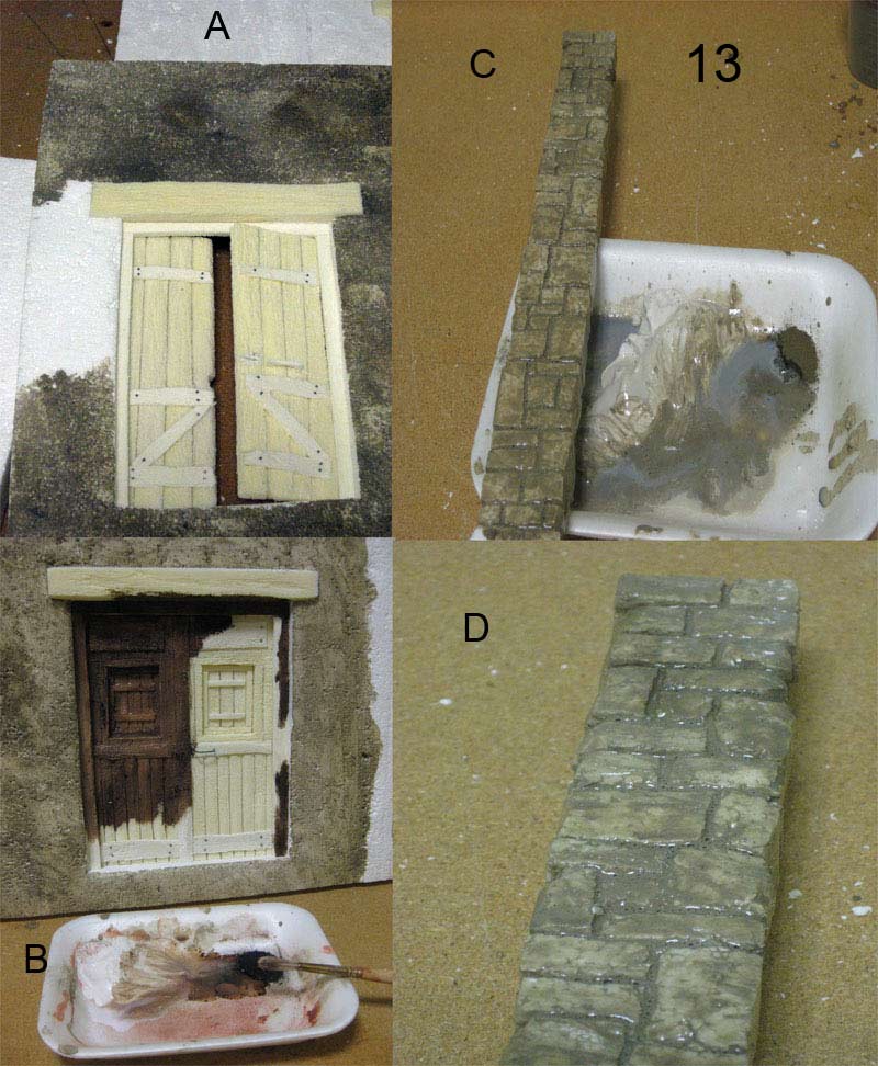 FOTO 13 : Haremos lo mismo en las otras piezas ,y pintaremos las partes de madera con pasta Adefix y nogalina en polvo ,y daremos una primera mano a las partes de piedra ,sombra natural y pasta adefix ,el suelo también una primera mano .Y esperar que seque .