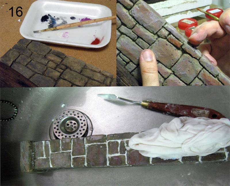 FOTO 16 :Pintado de piedras ,con una primera base de sombra natural con pasta Adefix ,empezamos dando algun tono en gris y violeta ,con muy poca pasta y un poco de agua y con el dedo extiendo a mi gusto ,una vez seco ,en este caso por las juntas le voy a meter pasta adefix ,con el paletin y con la misma tecnica que el suelo con agua retiro lo sobrante ....ya sabéis lo complicado que es explicar el pintado ,haber si con la foto .