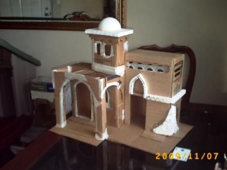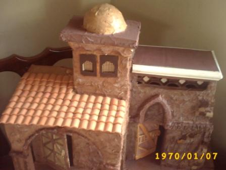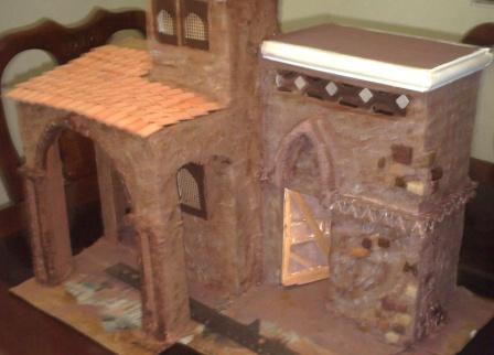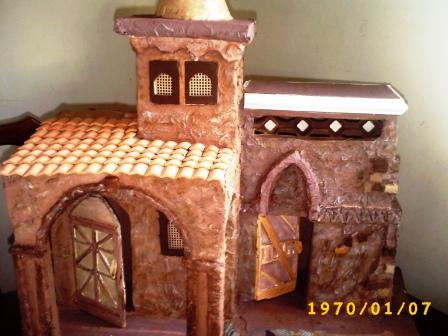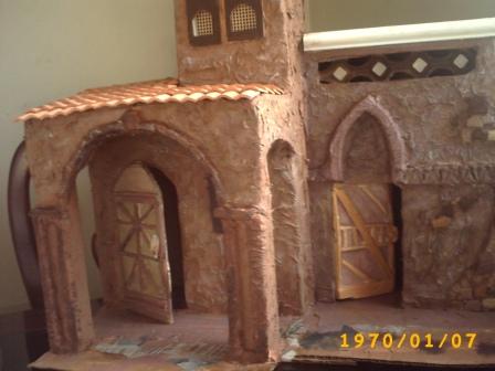 Hola paisano....bueno yo en lo personal al techo sobre la parte del arco se lo haria con un declibe. Tambien a las paredes frontales les pondria unos palitos que sobresalgan a manera de vigas. Puedes abrirle los huecos al carton y los pones luego que la terminas o los dejas asi y solo se los pegas cuando le estas añadiendo los ultimos detalles, te recomiendo la primera opcion pues de esta forma en el trajin de la guardada de un año para otro se golpean y se caen.