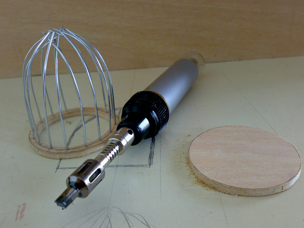4.- Para la jaula, cortamos dos circulos iguales de contrachapado, y a uno de ellos, le hemos cortado el centro, quedando como si fuera un aro, abriendo también los correspondientes agujeros para posteriormente insertar los alambres. (cuarta imagen)