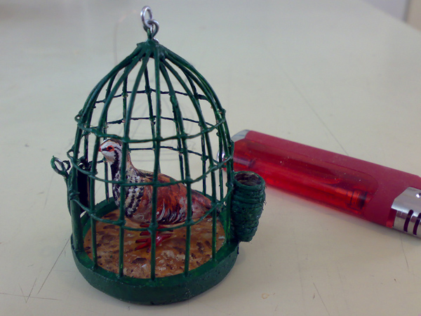 6.- Una vez soldado, hemos pegado la perdiz a la base (que es el circulo que nos queda); posteriormente hemos pegado esa base a la jaula. Además, hemos añadido un comedero y una puerta para detallar mas el trabajo.