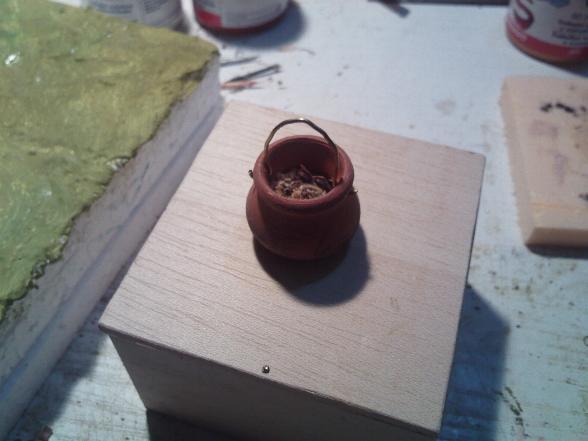 He empezado a construir una fogata con un circuito de 3 neón, dos parpadeantes y uno fijo, os dejo la foto de la caja que albergara el circuito electrónico y hará de soporte a la fogata, así como el puchero con la comida y pendiente de repintar.