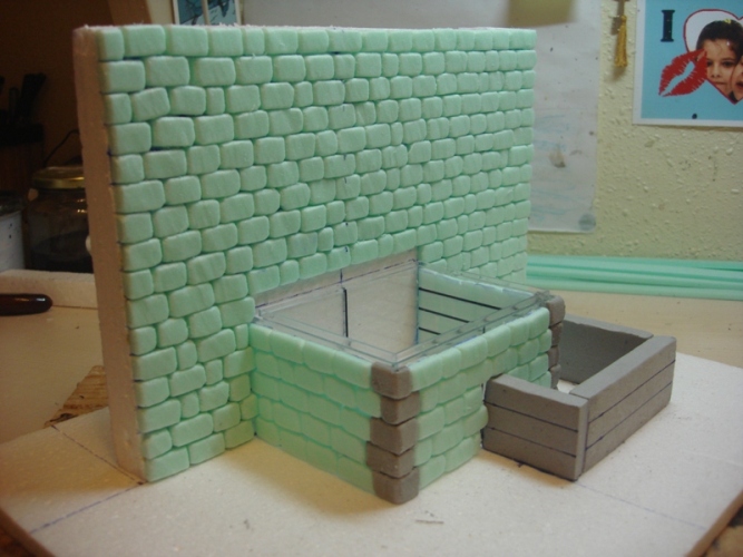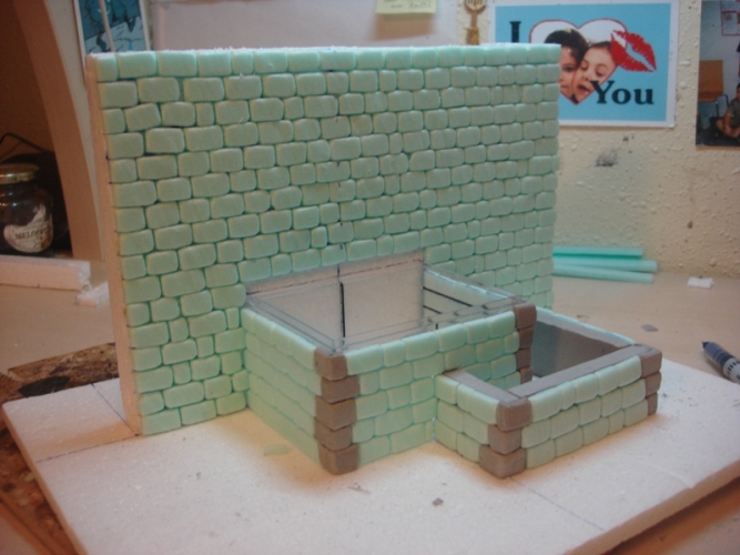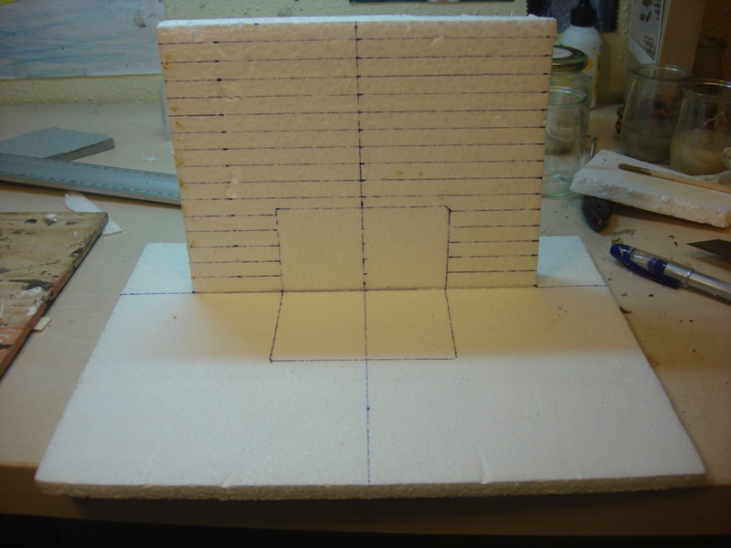 Empiezo con la construcción de la pared y base de la fuente, marcando las líneas que me ayudarán a guiarme para el pegado de los ladrillos (fotos 1 y 2). La pared y la base, están hechas con poliestireno expandido y los ladrillos con poliestireno extuído. La pileta, para evitar posibles problemas de fugas de agua, la hice con una caja de metraquilato que tenía por casa, cuestión de sacarle provecho a las cosas que tenemos por en medio J Marco también la pileta para hacer el alojamiento de la misma y no cubrirla con ladrillos (Foto 3).