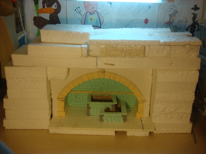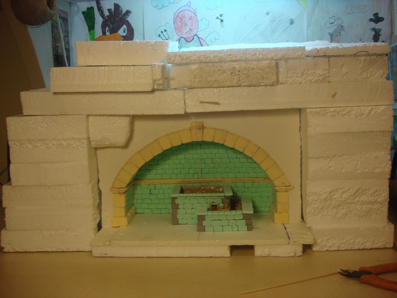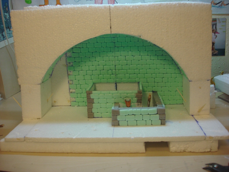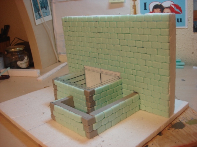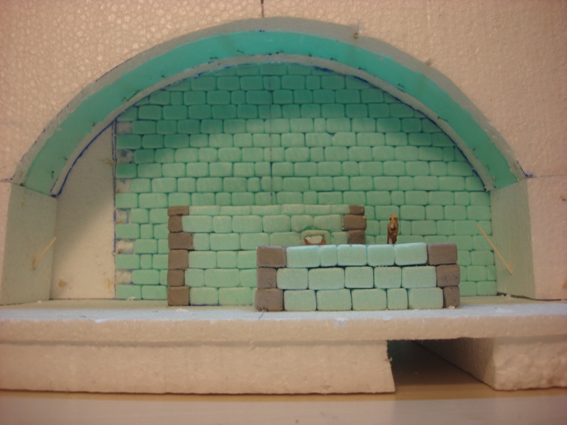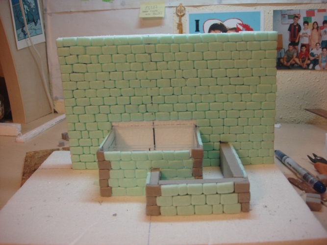 Con todo ya marcado, procedo a cortar el arco con la cortadora de porex y después, corto una a una las piedras haciendo en el interior de las mismas el encaje para después pegarlas en la estructura.