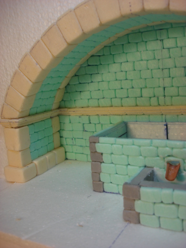 Aquí es donde el proceso sufre la metamorfosis. Me parecía una fuente muy sosa, por lo que decidí incrustarla un poco más en la pared y “embellecer” un poco el contorno, así que con porex expandido, hice un arco aunque previamente tuve que ensanchar un poco más la pared del fondo, lo que no supone ningún problema, pues se cubrirá todo con ladrillos (Fotos 19 a 23)