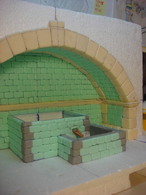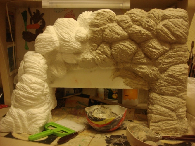 Llega el momento de juntar las dos partes (fuente y gruta) y toca retocar el acabado para que simule que la fuente se ha construido dentro de la cueva. Esta vez con yeso normal, hago la imitación a la piedra intentando dar la sensación de continuidad a las piedras que hacen la junta entre la pared y la roca (Foto 35)