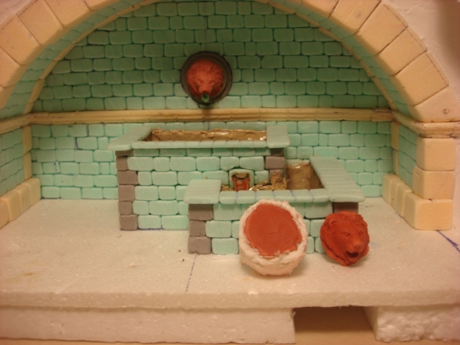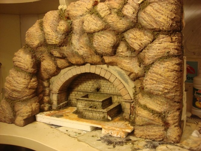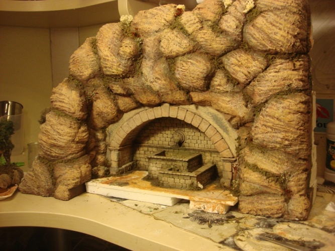 Sigo experimentando con las tierras y para el belén de este año, tenía pensado poner una fuente incrustada en una gruta. Para ello tenía pensado poner, la ya famosa cabeza de león como embellecedor del surtidor de agua, no obstante, durante el proceso de construcción, la fuente sufrió una metamorfosis del pensamiento inicial, al acabado final.