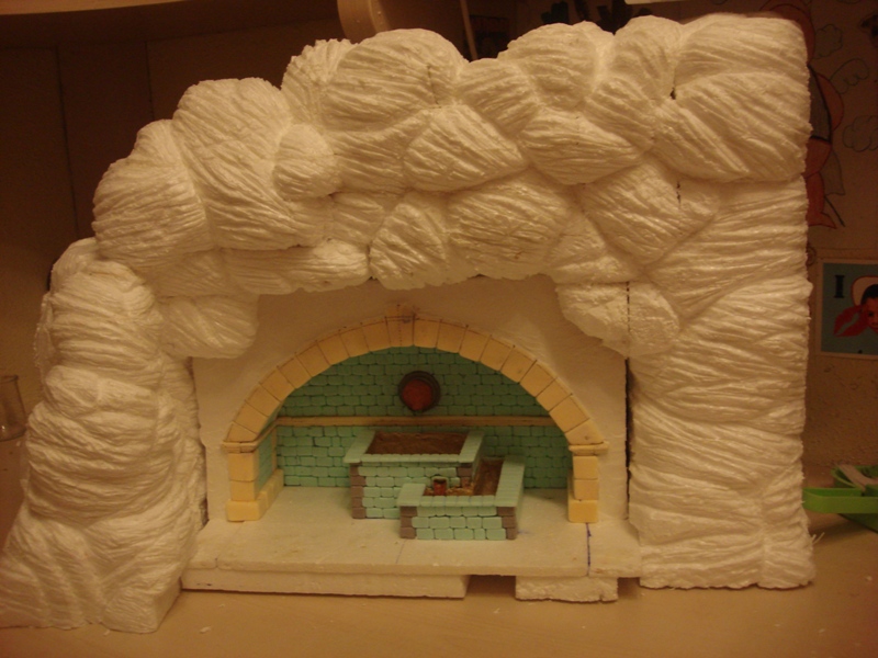 Paso a la construcción de la cueva, pegando con cola blanca trozos de porex expandido hasta darle la altura más o menos deseada. Es bueno hacerlo más grande de lo que quedará finalmente pues como después vamos a tallar el porex, es mejor quitar que tener que poner… (Fotos de 24 a 26)