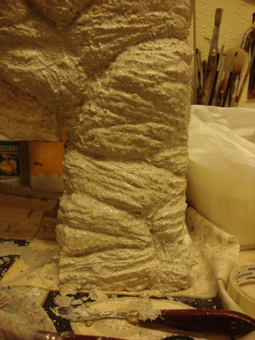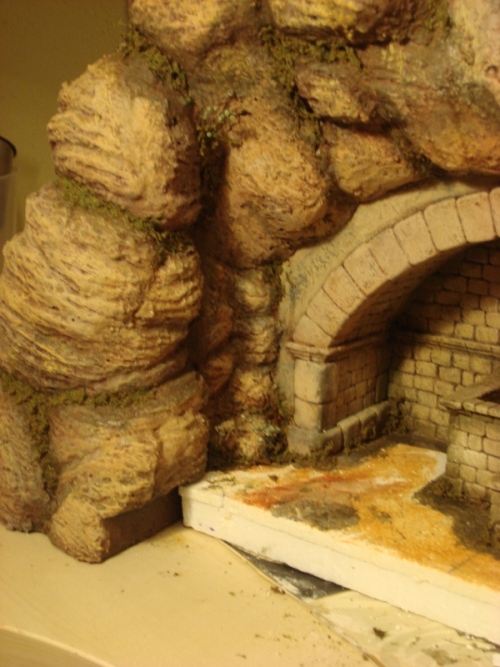 Hecho esto, paso a darle la textura a la roca, con una capa de yeso líquido mezclado con posos de café y tierra, disimulando un poco el tallado anterior, pero con cuidado de no cubrirlo del todo (Fotos de 28 a 31)