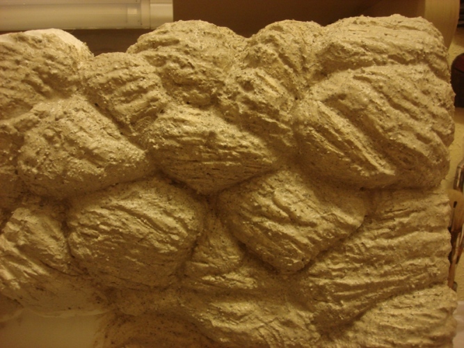 Mientras tanto, había ido dando capas de silicona a la cabeza hasta conseguir un molde resistente. Con pequeñas bolitas de terracota, iba rellenando el molde, apretando bien para que se llenase perfectamente y se marcaran bien los detalles (Foto 27) ya puestos, he hecho varias copias de la cabeza para posteriores proyectos. Con porex extruído, hice una base para incrustar la cabeza en la pared. Con un taladro y una broca fina, hice el agujero en la boca y con una caña de bebida, incrusté el surtidor que sobresale por detrás de la pared, donde irá el circuíto de agua desde el recipiente donde irá la bomba.