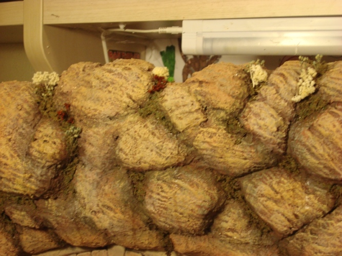 Ya solo queda pegar la vegetación. En una mezcla de cola de conejo de 2 cucharadas soperas con 200 ml de agua (si alguien lo va a utilizar, recordad que hay que dejar esta mezcla en remojo al menos 8 horas y después disolver el granulado al baño maría) incluyo varios tipos de musgo, más que nada por darle cierta variedad de colores y texturas, lo acabo adornando con unas pocas flores secas y se acabó (Fotos 37 a 40)