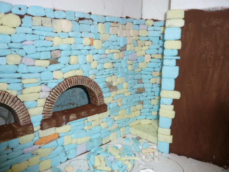 Foto 2: Para construir los muros de mampostería de esa vivienda utilizo planchas de poliestireno expandido (corcho blanco) de 2 cm de grosor, pintándolas de color oscuro para que al pegar los pedazos de poliestireno extruido que figuran las piedras dé sensación de profundidad. Todas las pinturas que utilizo son plástico mate.