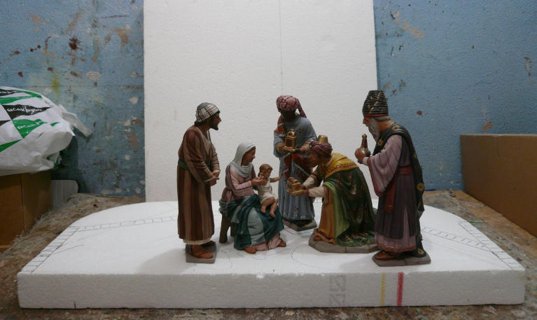 Foto 1: En primer lugar, sobre una pequeña plataforma de 65 x 30 cm, con los lados interiores redondeados para adaptarla al celaje de la arqueta, coloco las figuras buscando la posición adecuada y trazando el escenario a su alrededor, que será el interior de una casa en Belén.