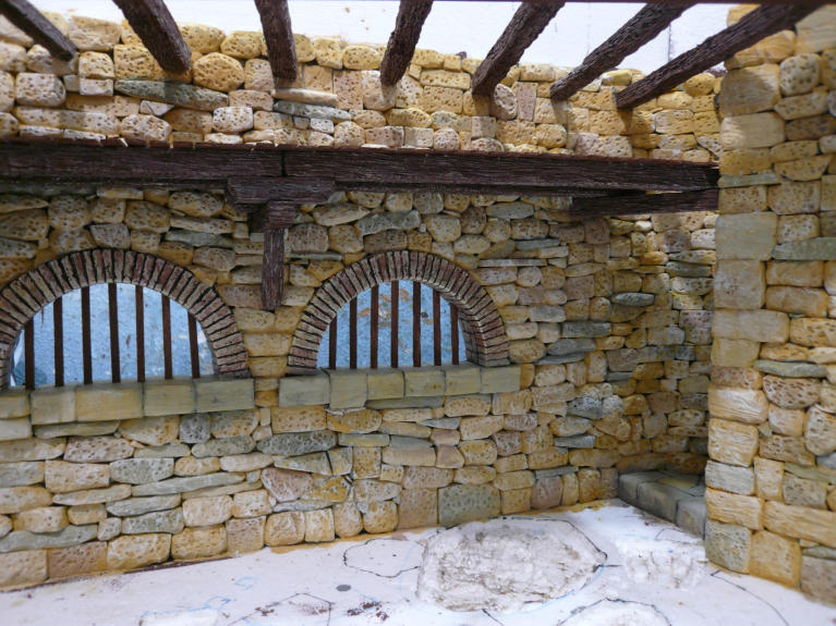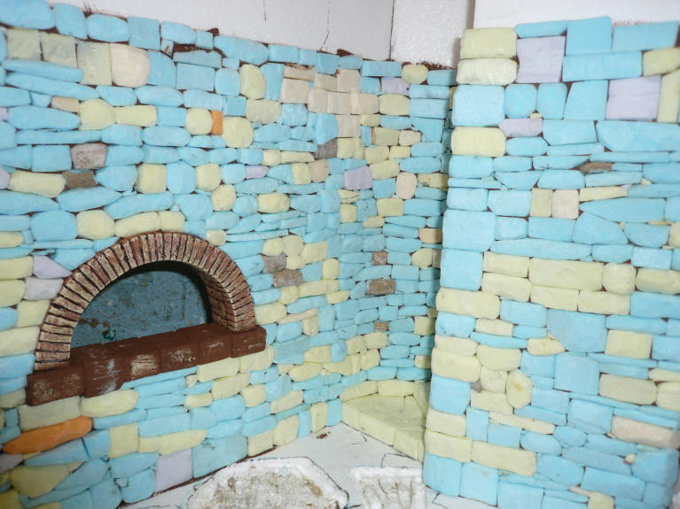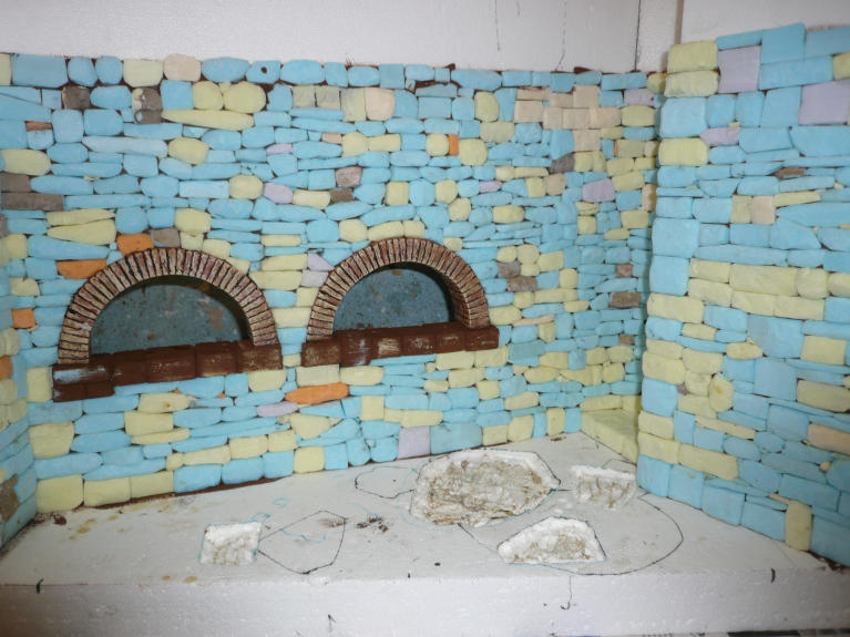 Foto 2: Para construir los muros de mampostería de esa vivienda utilizo planchas de poliestireno expandido (corcho blanco) de 2 cm de grosor, pintándolas de color oscuro para que al pegar los pedazos de poliestireno extruido que figuran las piedras dé sensación de profundidad. Todas las pinturas que utilizo son plástico mate.