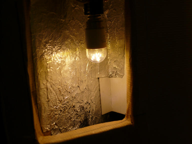 Foto 13: Especial cuidado hay que poner en la instalación eléctrica, utilizando regletas para los empalmes y bombillas de bajo consumo iluminando el exterior. Para que no se transparente la luz recubro las partes posteriores con papel de embalar y de aluminio encolados.