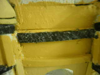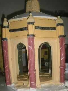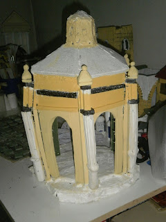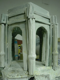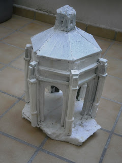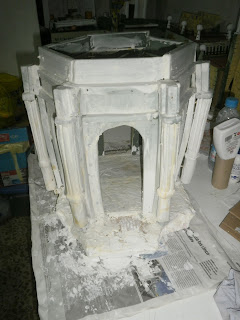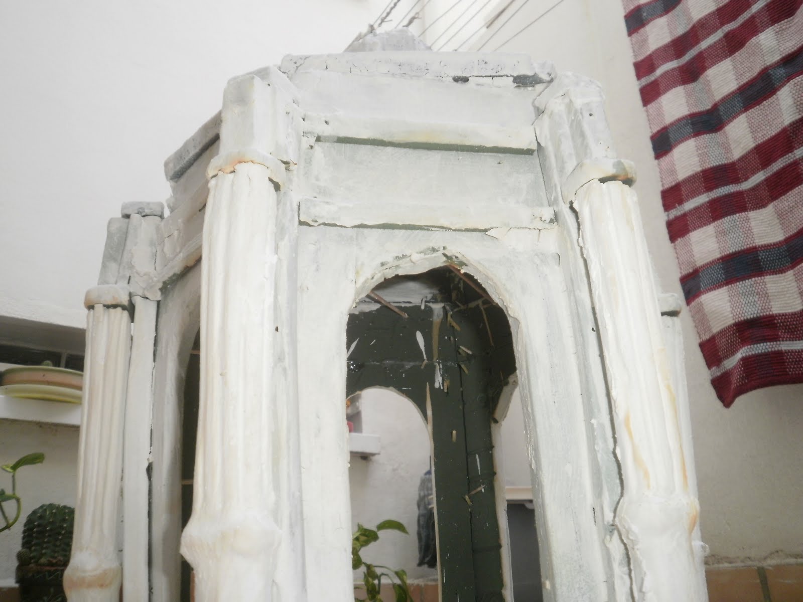 Aquí dejo fotos del estado actual del templete. Se ha pintado gran parte del templete a falta de las tejas, suelo y columnas y quedan dar algunos retoques de pintura a partes que la escayola ha rechazado. La parte negra simula el marmol que ha sido realizado con veladuras de pintura gris, blanca y negra dándolas a pincel seco.