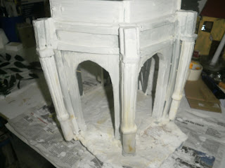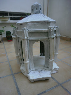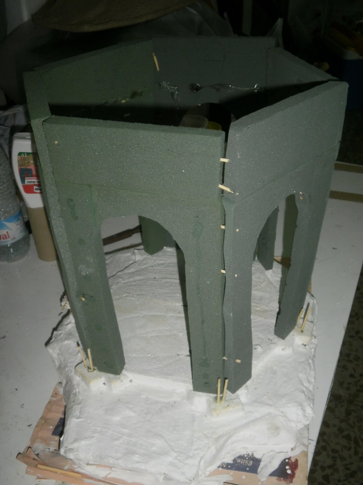 De momento he realizado la base, las columnas y las paredes con los arcos del templete por lo que falta la cúpula y la parte alta y finalmente se le pondrán todos los detalles a las distintas partes. Aquí van unas fotos.