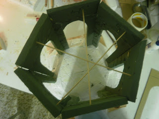 Ya he comenzado a realizar la cúpula, de momento solo he realizado la base en cartón sobre la que colocaré un capa de esponjilla y finalmente las tejas.