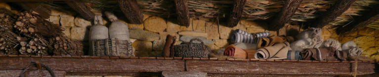 Pongo varias fotos en distintos ángulos para que se aprecie como ha quedado la escena. En la foto 22 se ve un detalle del atrezo en la naya (sacos, mantas, cuerdas, vasijas, cestos, cajas, haces de leña) y del techo de pajizo sostenido por la viguería.