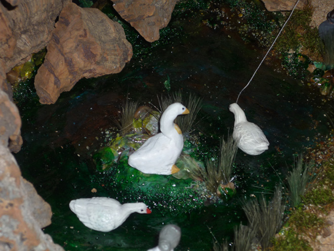 El laguito y el río están hechos sobre papel kraft (el papel marrón de embalar) que puse de base y sobre el que iría el serrín del belén. Aunque yo lo trabajé directamente en el sitio, aconsejo que el trabajo se haga aparte para evitar vertidos de barniz indeseables. El rio terminado se puede pegar o sujetar después al suelo del belén.