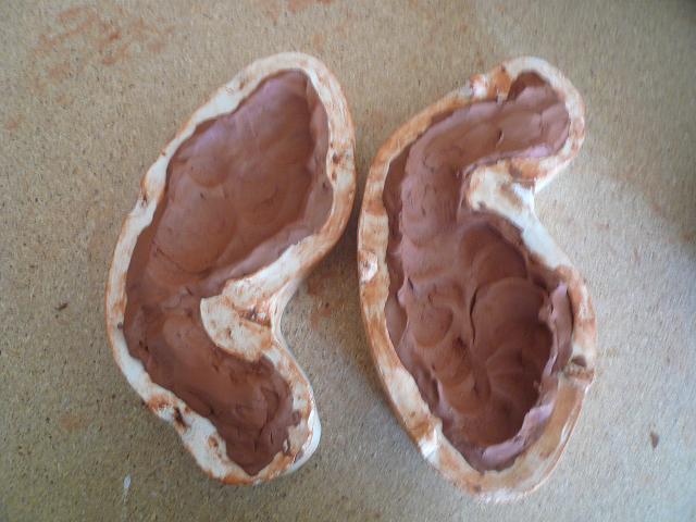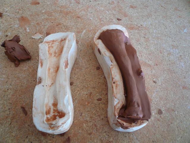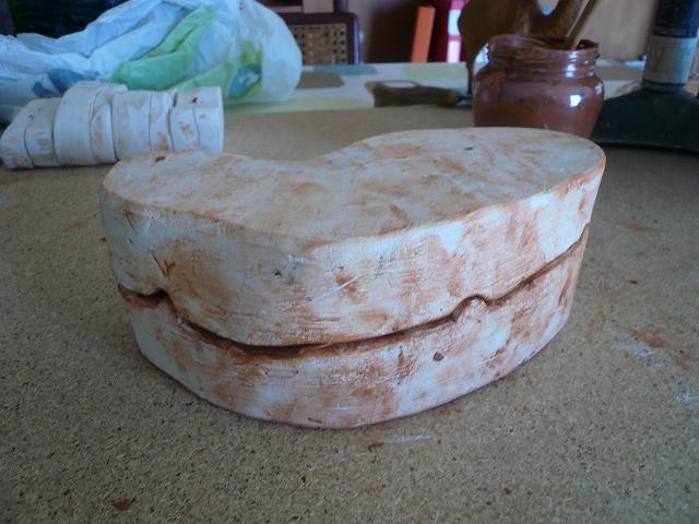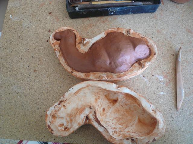 Una vez seco el molde, rellenemos cada parte de barro por el metodo del apreton haciendolo hasta la base del molde en cada una de las dos parte. Se procurará no dejar burbujas, ya que esplotaría la piezac en el horno. Tampoco hacer la pieza maciza, la parte de la panza está hueca y una vez terminada debemos pincharla por debajo para que salga el aire al cocerla. Una vez rellenado las dos partes del molde le untamos barbotina por las partes de la unión y cerramos apretrando con fuerza las dos partes para que se una, se deja un buen rato. Mientras vamos haciendo lo mismo con cada parte de las patas. Yo en este caso solo he rellenado una sola parte de la pata lo suficiente para que al cerrar el molde quede bien rellena y he metido un alambre a todo el largo de la pata para que no se rompa y no pasa nada al cocerlo. Se hace lo mismo, se cierra y se aprieta bien.