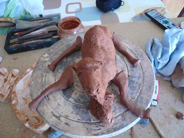 Como la parte del cuerpo esta fresca, la coloco en la torneta acunandole con barro y así puedo ir retocando un poco. Posteriormente raspo la pata que voy a unir al curpo y hago lo mismo en el cuerpo donde va a ir la pata, unto las dos partes de barbotina y las uno presionando y retocando con el palillo la unión. Así con las cuatro patas. Como las patas tienen alambre por medio y ya esta algo duro el barro puedo poner en pie la pieza y comienzo a retocar toda ella con cuidado. Hay que tener en cuenta que los primeros retoques se pueden hacer con el barro tierno, pero lo mejor es dejarlo que endureza un poco y se hará mejor los detalles.