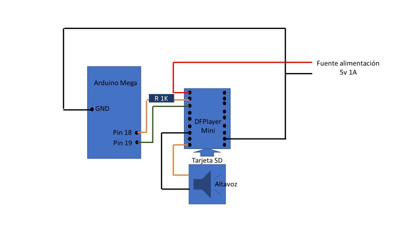 La tarjeta SD tiene que ser como máximo de 32G, con lo que esto no es un problema. La alimentación del DFPlayer es mejor que sea de una fuente de alimentación externa, de 5v y 1A, conectando siempre GND con GND de Arduino.