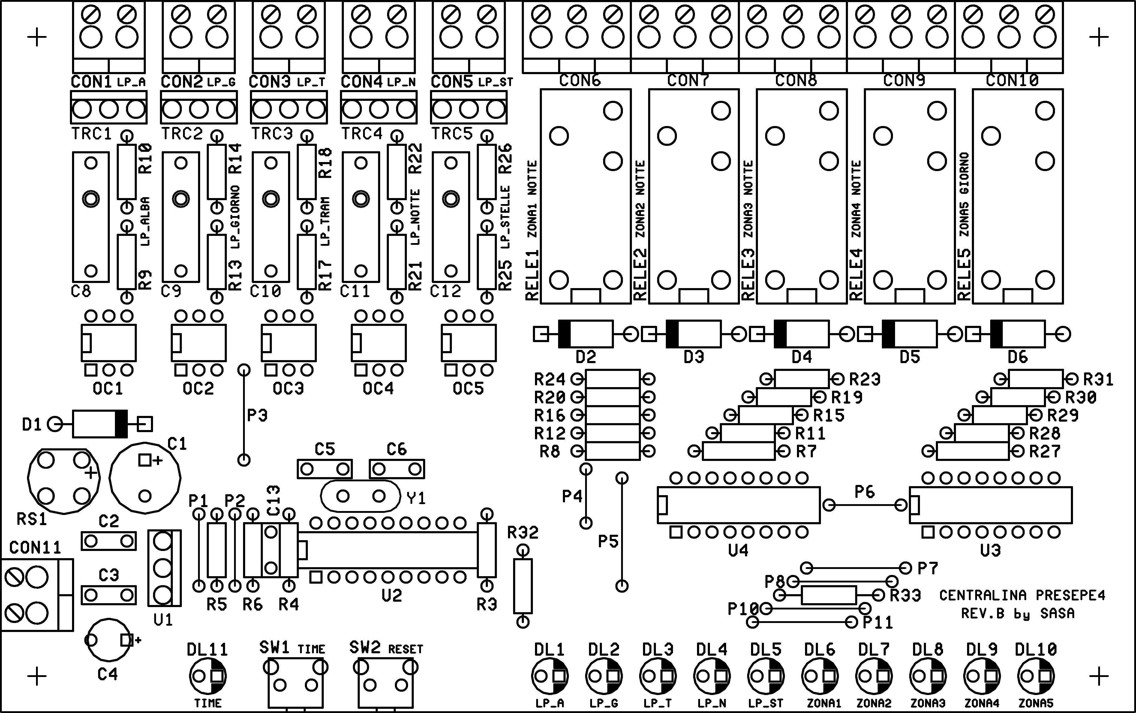 Esta unidad cuenta con 5 salidas para lámparas incandescentes (controladas por triac) con efecto gradual (llamados Amanecer, Día, Puesta de sol, noche y estrellas) además de salidas ON-OFF controladas por relés (llamadas zona 1, zona 2, Zona 3 y Zona 5 Zona 4) que pueden ser utilizadas para manejar las luces de las casas o los motores de los pastores
