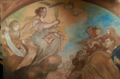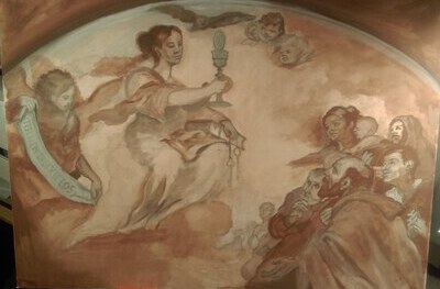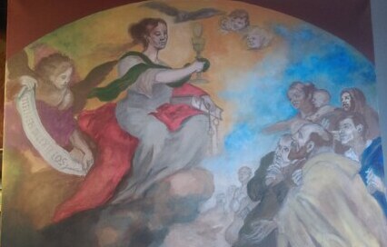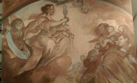 La Iglesia como suministradora de la Eucaristia , verdadera protagonista de la composición, se muestra como una matrona sentada en una nube, que sostiene en una mano el cáliz con el Santisimo, mientras que con la otra sostiene la Biblia y las llaves de Pedro.