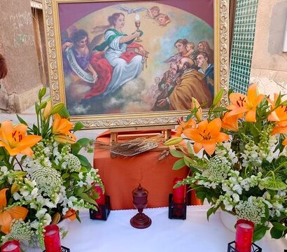Este cuadro que pinté hace ya tiempo , me sirve para adornar la mesa del dia del Corpus que ponemos en mi calle dl pueblo.