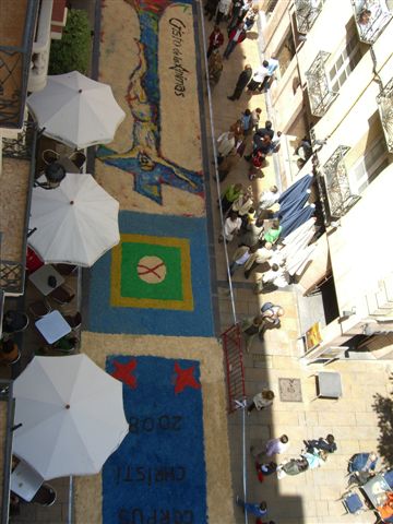 La pena ha sido,como no,el clima,ya que aunque el agua respeto grán parte del día,al final y para desesperación de todos,hizo su aparición.No pudo celebrarse la procesión y la gente no admiró en todo su esplendor todas y cada una de las alfombras realizadas por multitud de asociaciones.